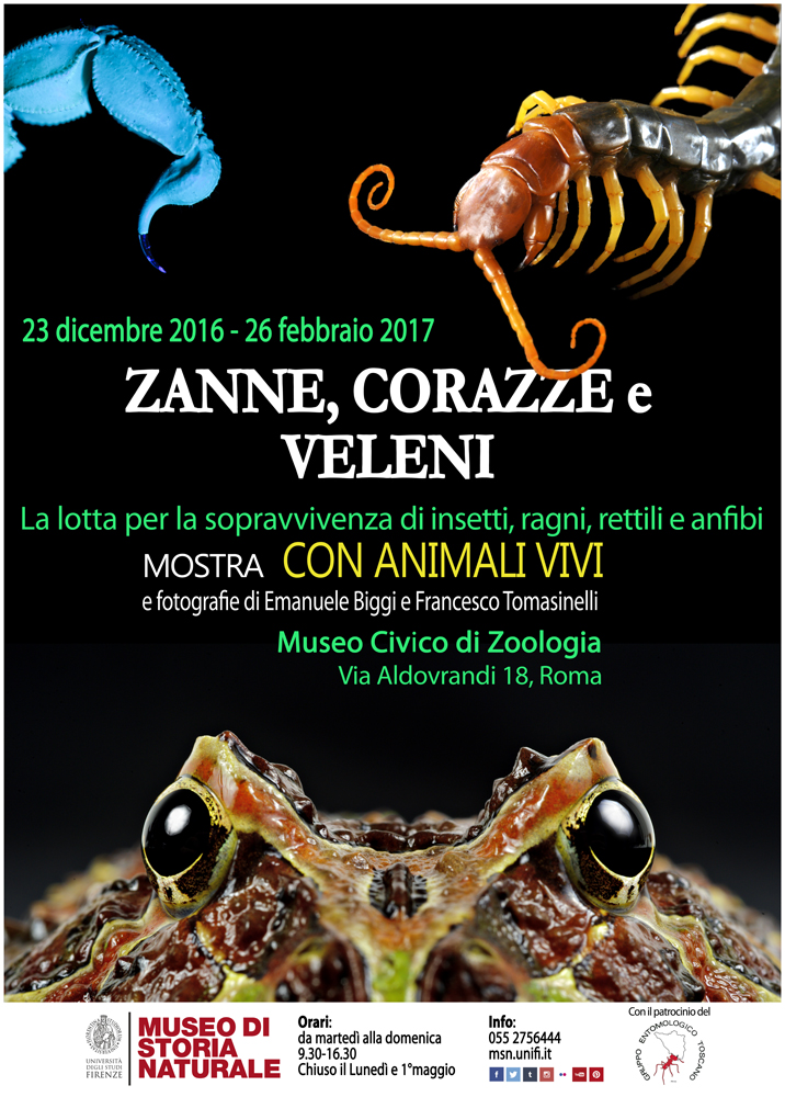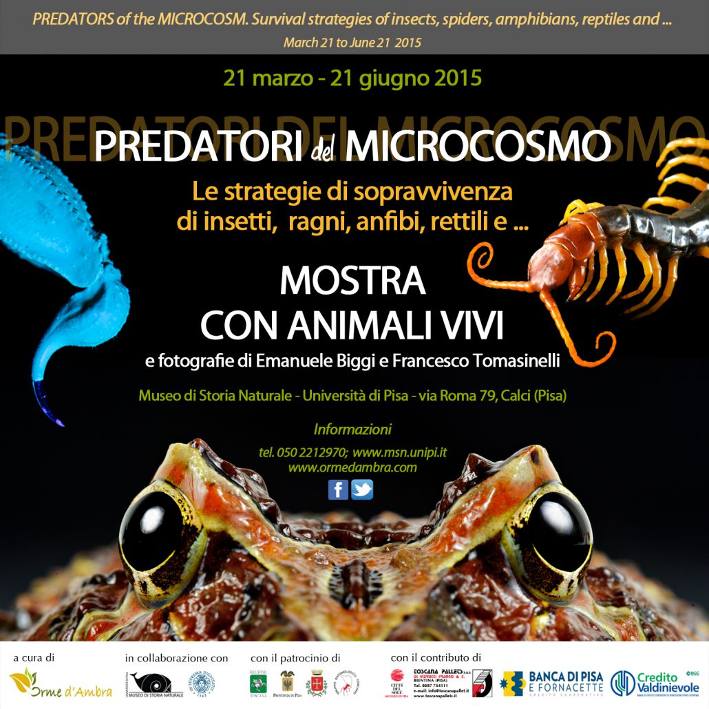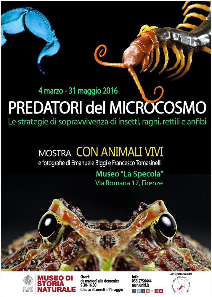Le mostre “Predatori del microcosmo” e “Zanne, corazze e veleni” sono dedicate a Insetti, Ragni, Anfibi, Rettili, ovvero a tutti quei piccoli animali che hanno sviluppato tecniche di caccia e sopravvivenza uniche al mondo, dando vita ad una “corsa agli armamenti” complessa e senza sosta, che non ha riscontro, per ricchezza e originalità, in quasi nessuno degli organismi di taglia superiore.
